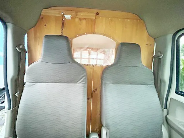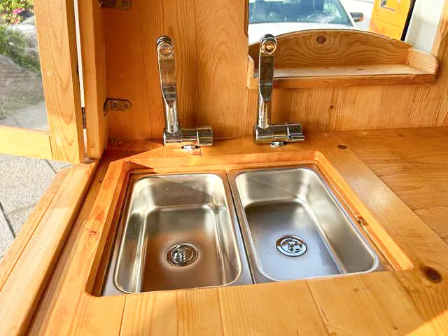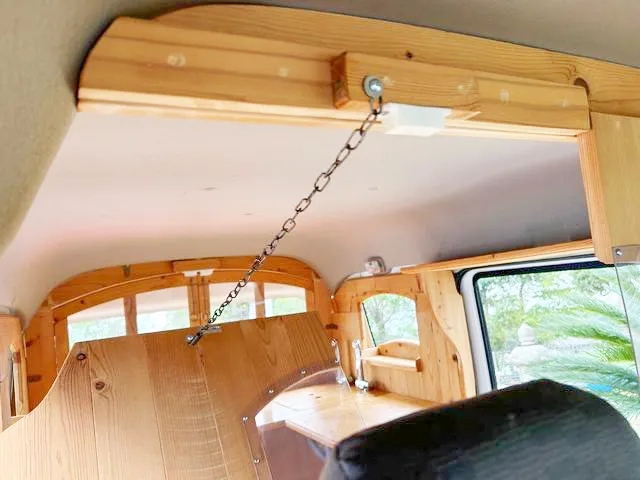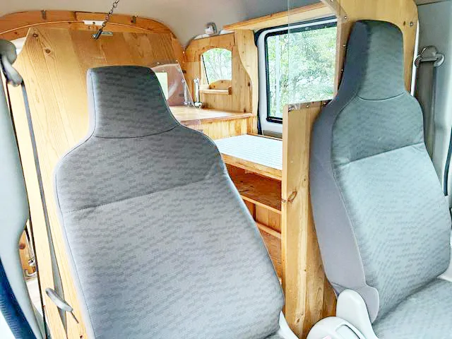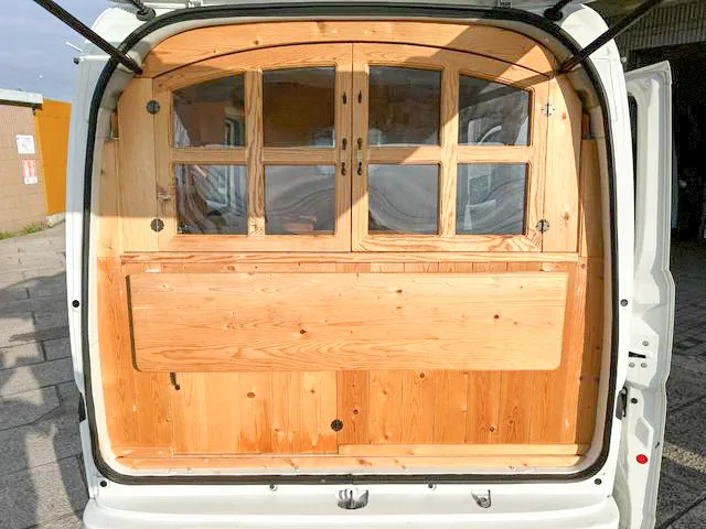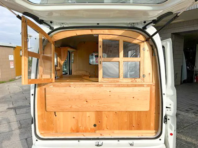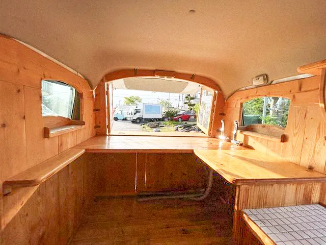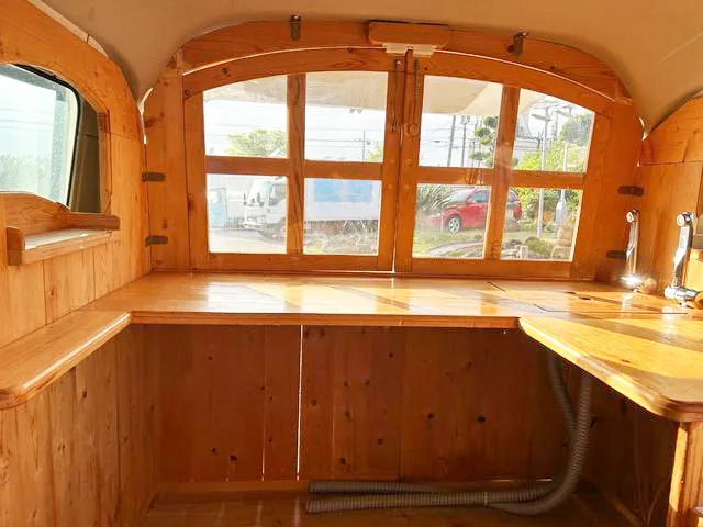 カントリー調なキッチン・後部窓が可愛いバン型キッチンカー。