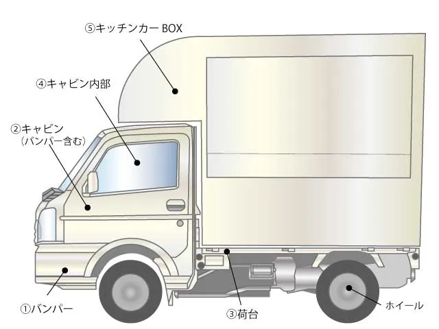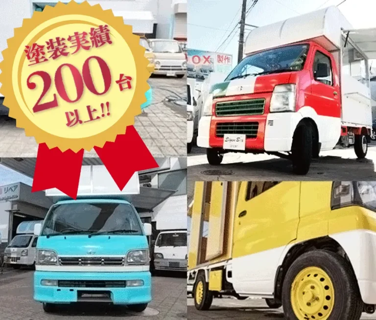| 塗装 | ・車体+BOX塗装 45万円~ ・BOX塗装(ラッピング) 30万円~ ・車体全塗装 15万円~ ・バンパー 3万円~ ・キャビン 10万円~ ・キャビン内部 7万円~ ・バンパー+キャビン 15万円~ ・荷台 3万円~ | 軽トラ価格 その他の車種についてはお尋ねください |
